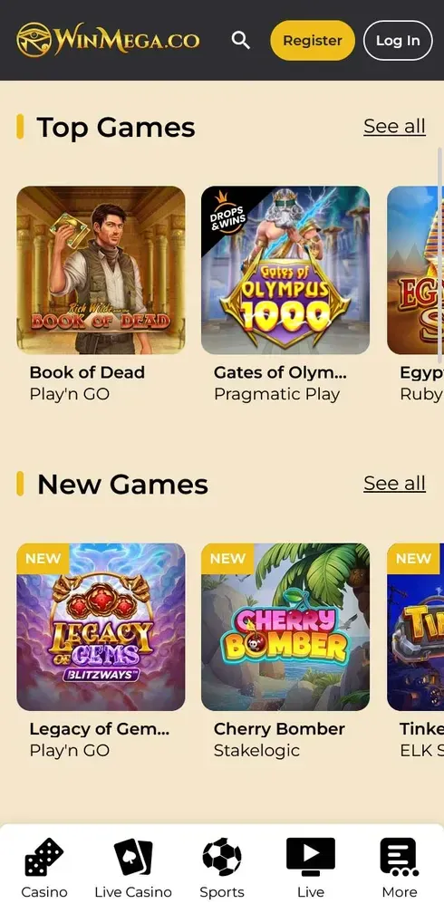 De spelvariatie blijft op mobiel hetzelfde, inclusief progressieve jackpots en live dealer-titels. Als je van WinMega slots houdt, vind je een breed aanbod van studio’s zoals NetEnt, Nolimit City, Betsoft, Pragmatic Play, Novomatic, Apricot (Microgaming), ELK Studios, Big Time Gaming, Yggdrasil en Play'n GO. In het casino vermelden we een gemiddeld uitbetalingspercentage van 97,76%, en de lobby bevat Slots, Tafelspellen, Live Dealer, Jackpot Games, Crash Games en een Sportsbook.